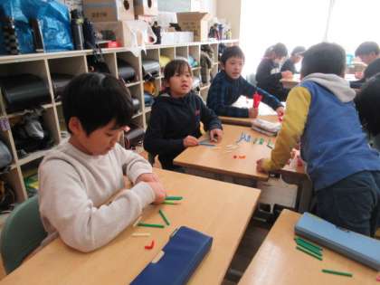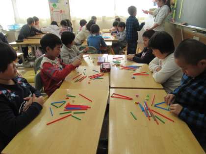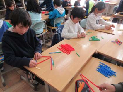 ストローとモールで、三角形を作ります。辺の長さの組み合わせから、三角形の特長を見つけます。