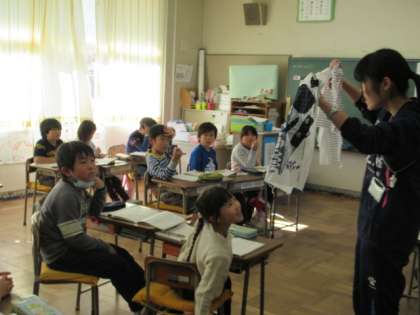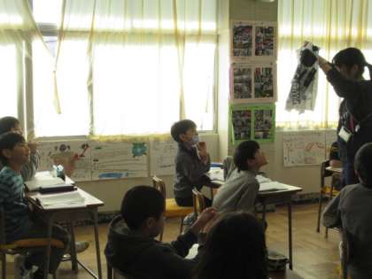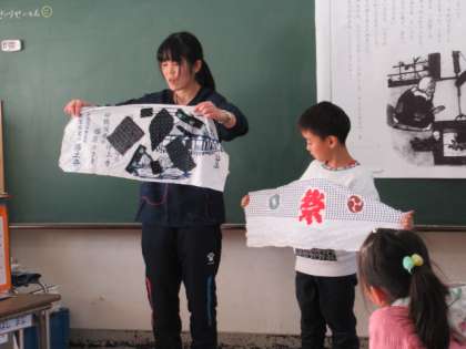 「かさこじぞう」の学習です。じさまがじぞうさまにかぶせた手拭い。今の子どもたちにはぴんとこないので、先生が実物を持ってきて見せてくれました。