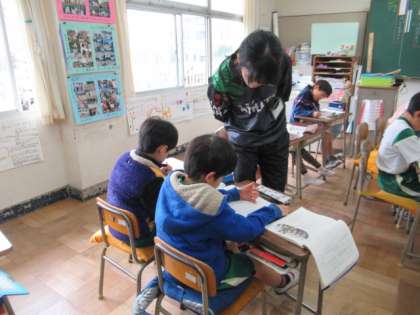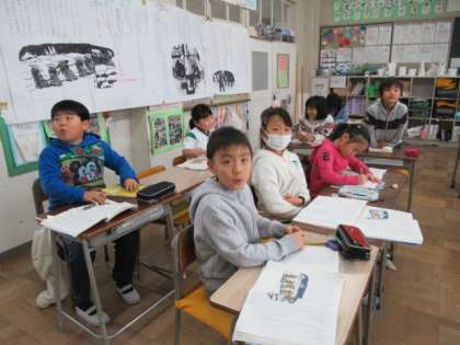 「かさこじぞう」を読んでいます。教室には、これまでの学習の足跡が掲示され、子どもたちはお話の世界を行きつ戻りつしながら考えています。