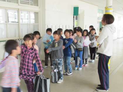 廊下に整列して、図書館へ向かいます。並べ方も並び方も、上手ですね。