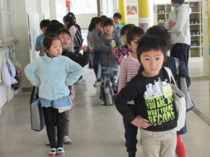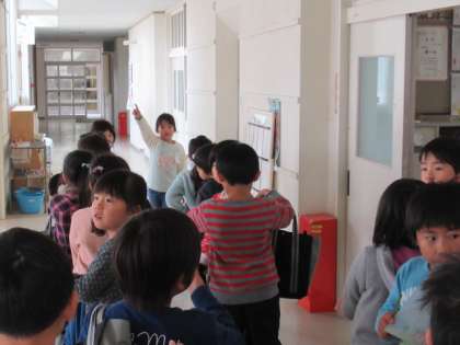 廊下に整列して、図書館へ向かいます。並べ方も並び方も、上手ですね。