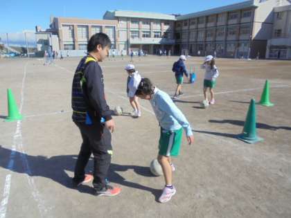 サッカーをやりました。ドリブルがうまくなりましたね。