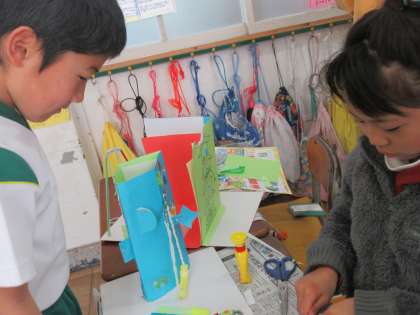 「まどをひらいて」の工作です。まどを開くと、何が見えるのかな?