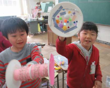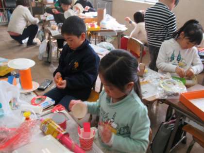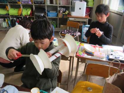 紙コップやラップの芯と、紙皿を組み合わせて、ゆらゆら動いたりころころ転がったりするおもちゃを作っています。
