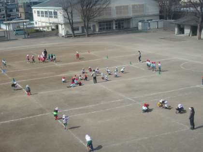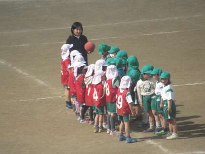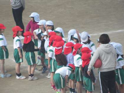 1年生が、体育の時間に学年合同でドッジボール大会をしています。