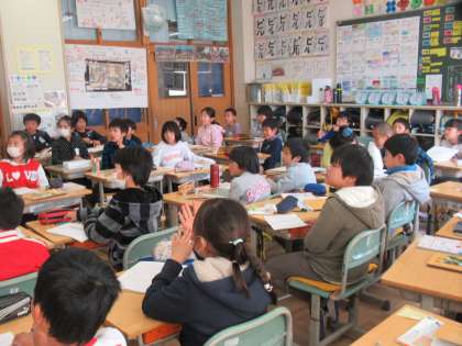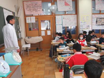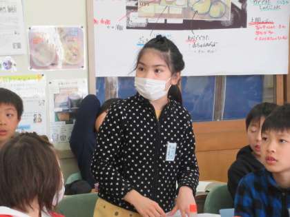 物の重さの学習です。重さは変えずに、一つの大きな粘土のかたまりと、小さな団子にしたりつみあげたりと条件を変えたときでは、重さに変化があるのか実験し、結果を報告していました。