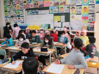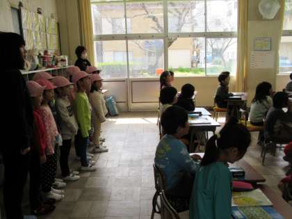 今日は、校区にある保育園から、小さなお友だちが来てくれました。年長さんたちで、入学を控えて、小学校の様子を見にきたのです。小学生は、かわいい来訪者に興奮気味。なんだか張り切っています。