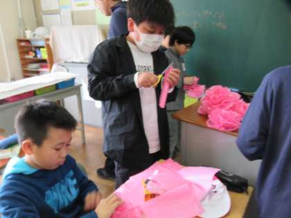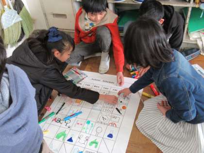 6年生を送る会を控えた5年生は、とにかく忙しい。英語の時間に考えた「英語で作る夢の時間割」を仕上げた班は、6送会準備にシフトします。