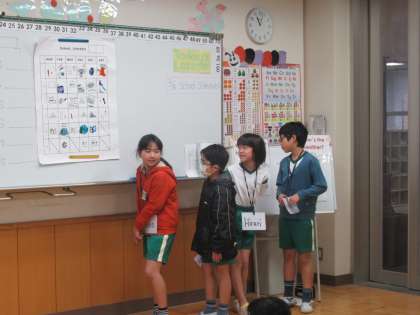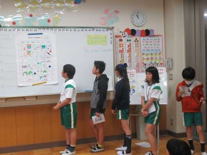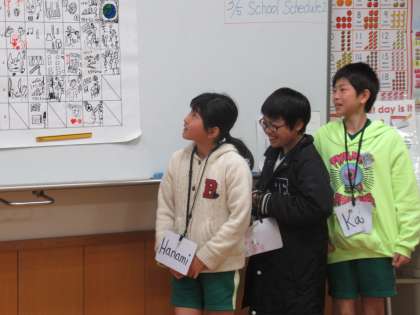 英語で作った時間割を、班ごとに発表しました。曜日ごとに一人ずつ発表するので、みんなが英語で曜日・教科名・何時間目という言い方を経験していきます。