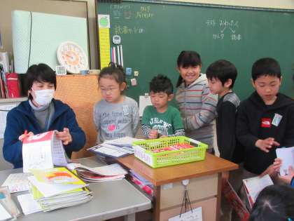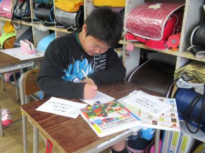 テストが終わった子は、ドリルの仕上げ。カルタの仕上げをしている子もいます。先生に確認してもらいながら、確実に仕上げていきます。