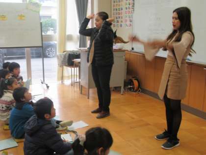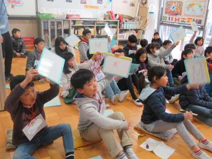 ALTの先生の発音を聞いて、アルファベットを当てます。聞き取ったらホワイトボードに書き、正解すると大喜びでした。