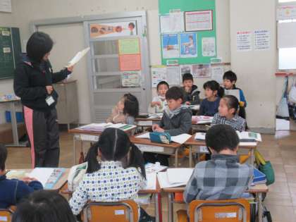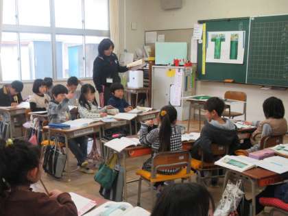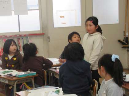 「ろくべえ まってろよ」を読んでいます。お家の方も学習した覚えのある、ロングセラーの教材です。