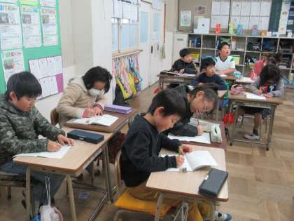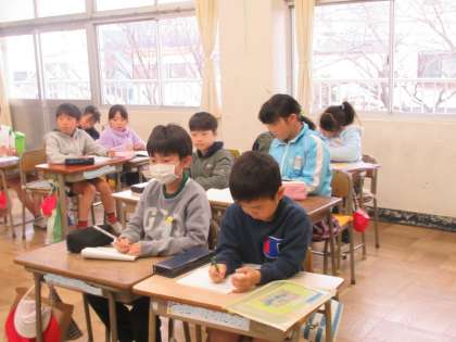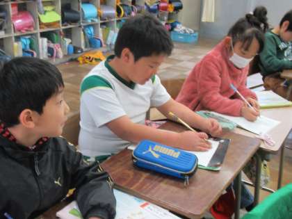 先生が読み上げる予定を、正確に聞き取って予定帳に記入します。もうすぐ3年生になる子どもたちは、授業の内容までしっかり聞き取れるようになりました。
