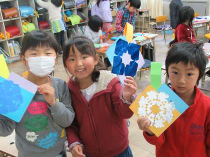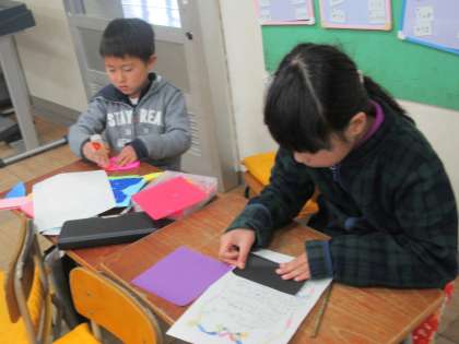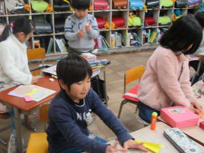 新1年生へのプレゼントバッグを作っています。自分たちも、1年前の入学式の日にもらったプレゼントバッグ。今度は、後輩の1年生のために、心を込めて作ります。