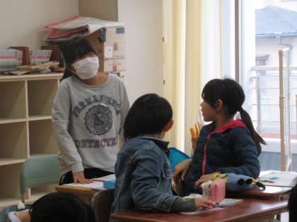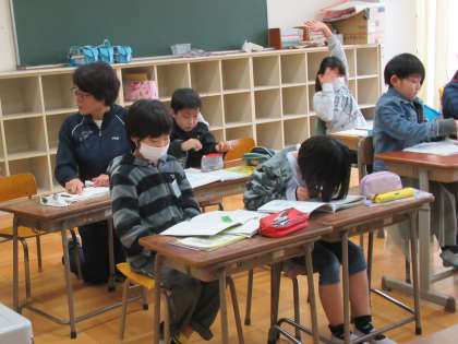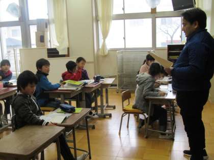 3クラスを4教室に分けて授業をしています。習熟度によって学習方法を変え、その子に合った学び方で3年生のまとめをします。