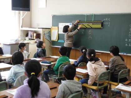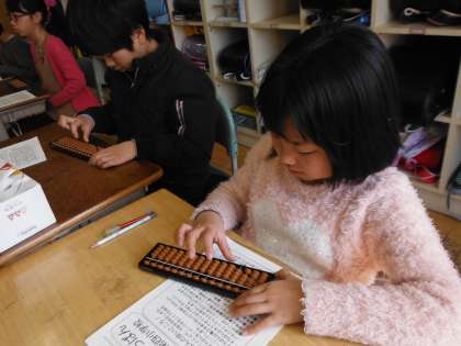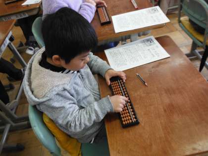 小川そろばん塾の小川先生と一緒に、そろばんの学習を3日間行います。初日の今日は、そろばんの玉のはらい方や、足したり引いたりする時の指の使い方について丁寧に教わりました。