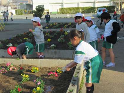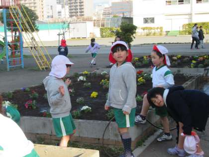 1年生が、朝から花壇の水やりをしています。あたらしい1年生のために、心を込めてお世話します。