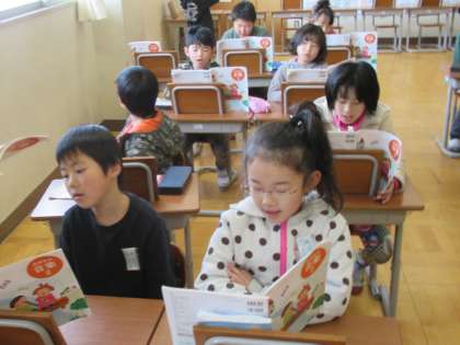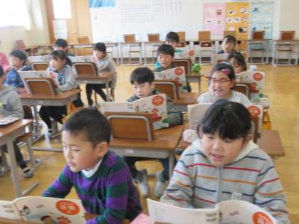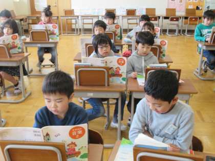 音楽室に近づくと、すてきな歌声が聞こえてきました。各国のあいさつの言葉が入った歌を、楽しく歌っていました。