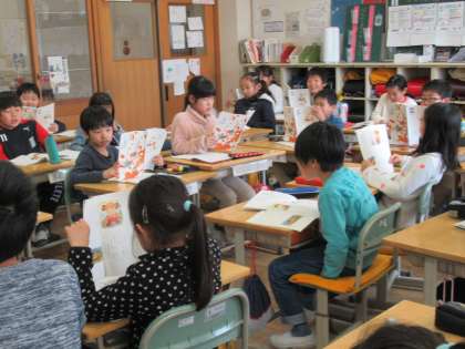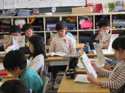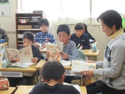 先生が、教科書の物語文を読んでくれました。ゆかいな表現に、子どもたちからは、思わず笑い声が起こっていました。