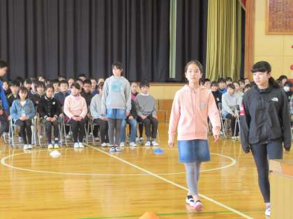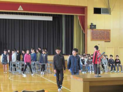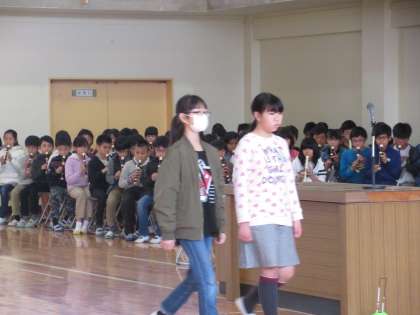 5年生のリコーダー演奏に合わせて、退場します。まだ早足の子もいて、ゆったり歩けるよう指導がありました。