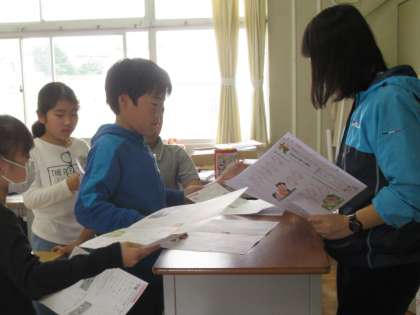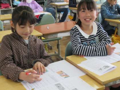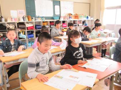 4年生の復習のテストがもどってきました。テスト直しをして先生に見てもらいます。こんなににこにこしているのは、間違ったところが同じで、おもしろくなってしまったそうです。