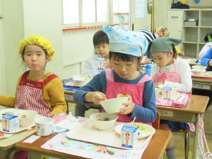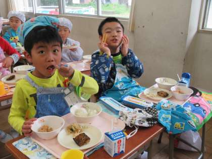 今日は、鯖にゴマがたくさんついた「鯖の南部焼き」がメインです。初日のカレーから、急に大人っぽいメニューになりましたが、がんばって食べています。