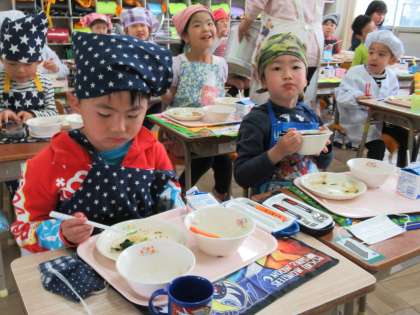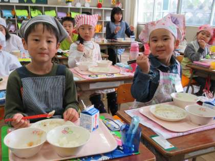 今日は、鯖にゴマがたくさんついた「鯖の南部焼き」がメインです。初日のカレーから、急に大人っぽいメニューになりましたが、がんばって食べています。