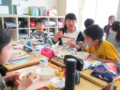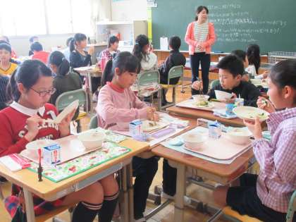 高学年になって、給食の量が増えた5年生。大盛りを、ぱくぱくいただきます。