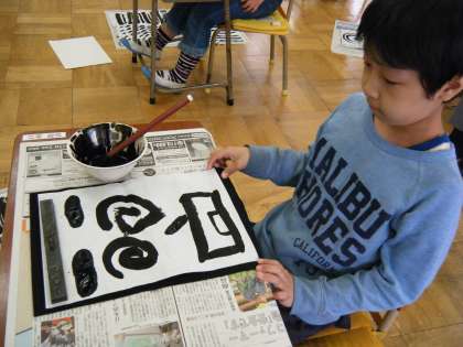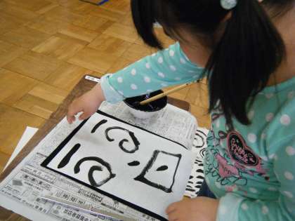 教頭先生に、上手な筆の使い方を教えてもらいました。練習をしていたら、あら不思議。顔ができてしまいました!