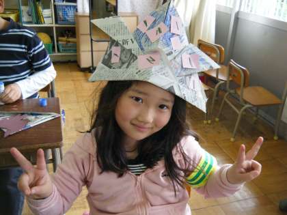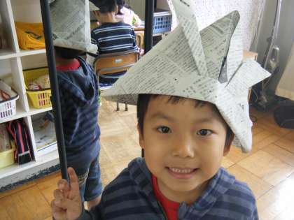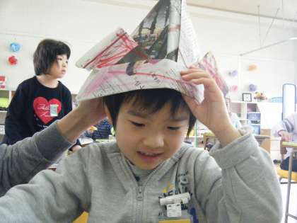 図工で、みんなで新聞紙兜を作りました。似合っているかな?