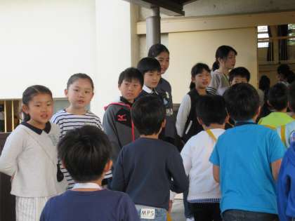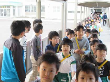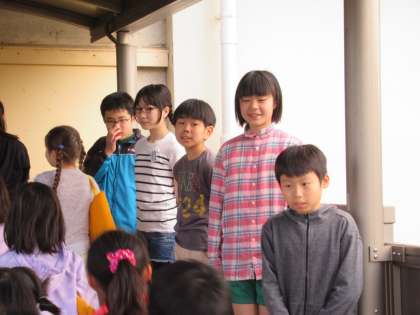計画委員があいさつで出迎える中、学級ごとに入場します。さわやかなあいさつの声が響きます。