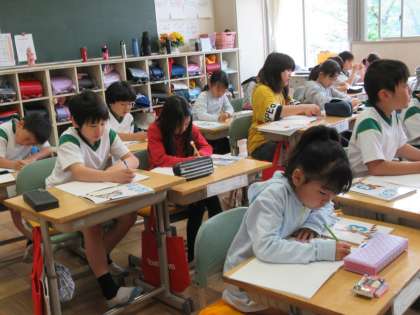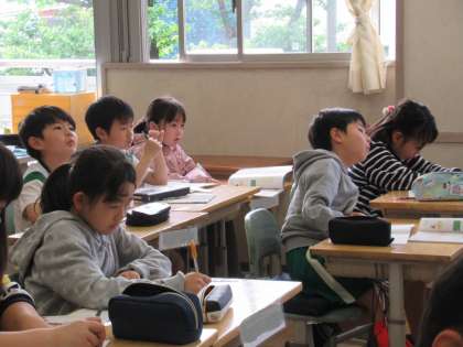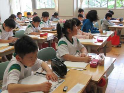 先生が黒板に問題を書くのといっしょに、子どもたちもノートに書いていきます。真剣な表情ですね。