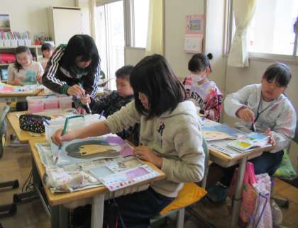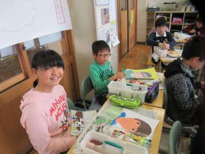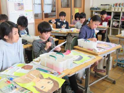 絵の具で色を着け、すてきな自画像が仕上がっていきます。