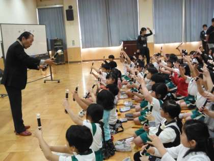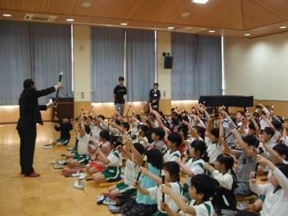 多目的ホールで、3年生のリコーダー講習会が行われました。はじめてのリコーダーです。専門の先生に、リコーダーの持ち方や姿勢なども丁寧に教わりました。シとラの音の出し方も覚え、きれいな音が出るようにがんばりました。みんな真剣に取り組んでいました。