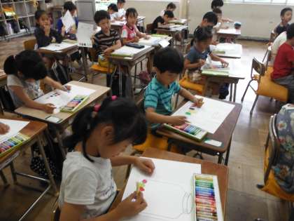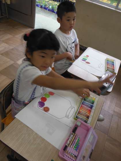 いろいろなあじが何色になるのか考えて瓶の中に飴を描いていました。
