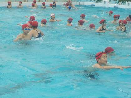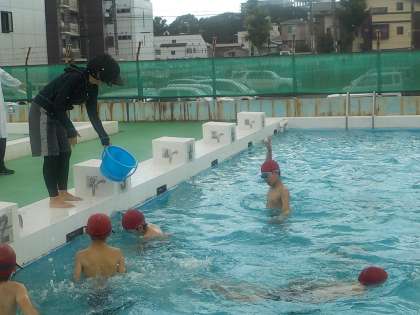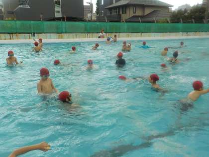 プール開き実行委員が進行して、クラス対抗鬼ごっこやボール拾いを楽しみました。