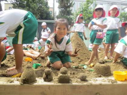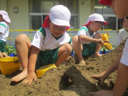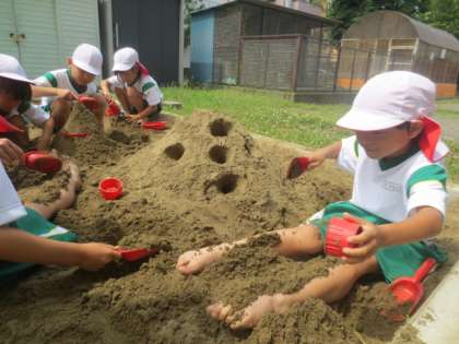 今日は、砂や土と仲良くなるために、砂場で遊びました。