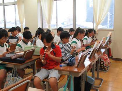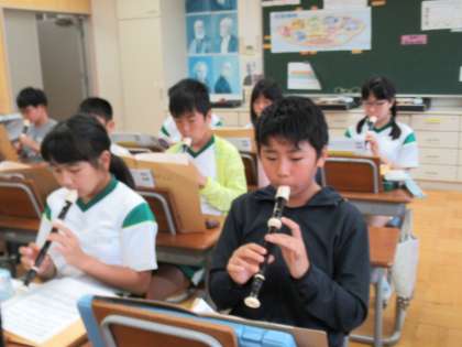 先生の伴奏に合わせて、リコーダーを演奏しました。