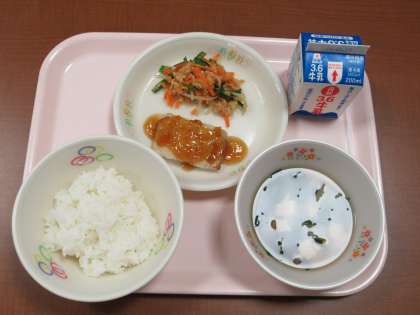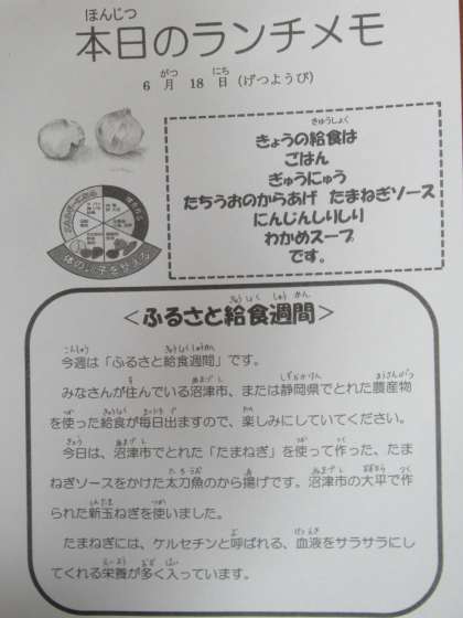 今週は、「ふるさと給食週間」です。沼津産・静岡産の食材がたくさん使われます。今日は、太刀魚の唐揚げに、沼津大平産のタマネギを使ったタマネギソースがかけられています。甘味があって、おいしいソースです。