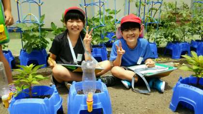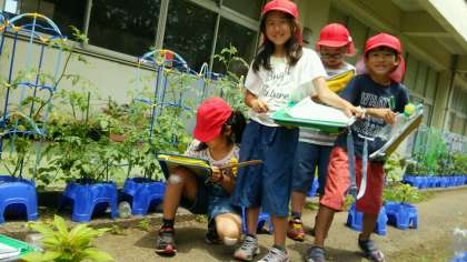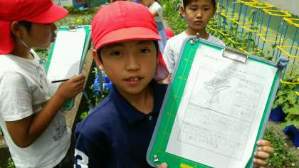 3年生は、ホウセンカを育てています。だいぶ増えてきた本葉の様子をよく見て、カードに記録していました。