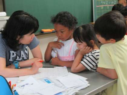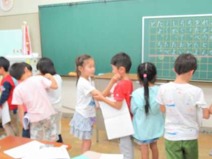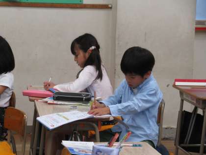 ノートに短文を書いています。小さく書く「つ」や「よ」などが難しくて、先生に直してもらっていました。上手に並んで待っていてね。