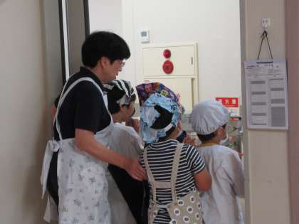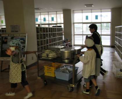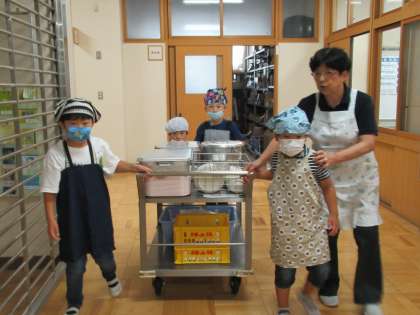 給食当番さんたちが、配膳室にワゴンを取りにきました。しっかりあいさつをして、上手に運搬します。