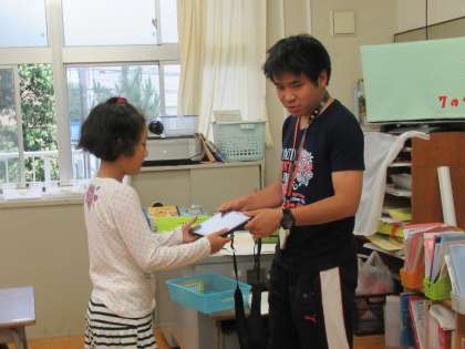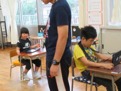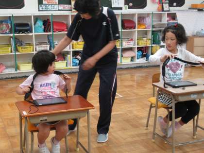 机の上を整理して、「タブレットを貸してください。」と自分で言ってから、学習に入りました。電源を入れたりする基本的な操作は、もう自分で行うことができます。