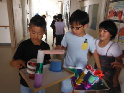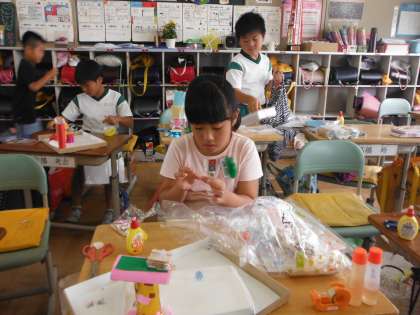 図工の作品「コロコロガーレ」ができあがりました。みんな工夫して、すてきな作品ができあがりました。早く完成した子は、進んで掃除もしています。主体的に動いています。
