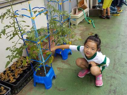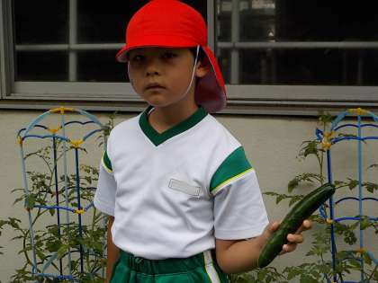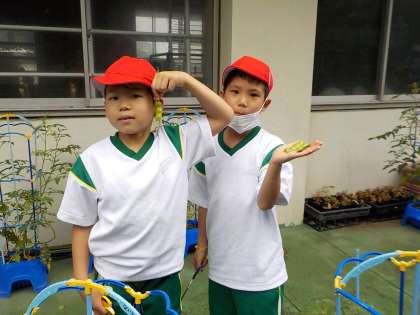 2年生は生活科で野菜を育てています。毎朝自分の野菜の様子を見に来る子も多いです。大きく育った野菜が収穫できました。