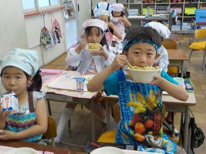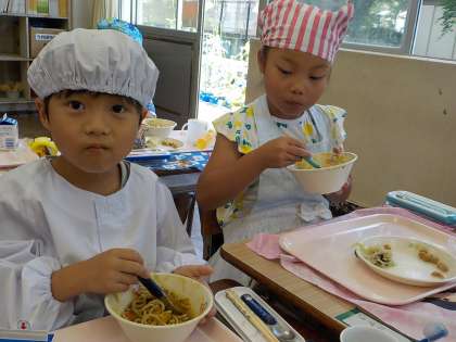 今日のメニューはカレーソースのソフトめんです。カレーの辛さの感じ方はそれぞれのようで、「辛くなーい」「辛くてひりひりする」と口々に言いながらがんばって食べていました。