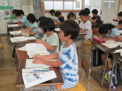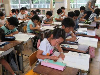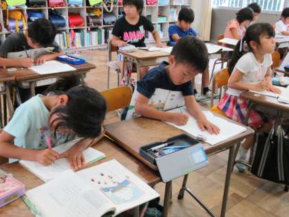 先生が黒板に書いた学習課題を、ノートに写します。学習の約束にそってノートをとることも、大事な学力です。