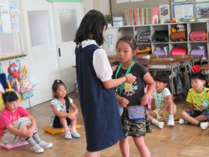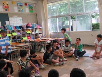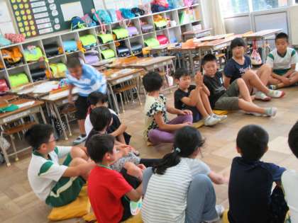 各教室でも、6年生が企画した遊びを、たてわりの仲間で楽しみました。この教室では、ハンカチ落としやいすとりゲームを楽しみました。1年生がばつゲームの自己紹介になると、困ってしまう前に、すかさず6年生が寄り添って助けてくれました。