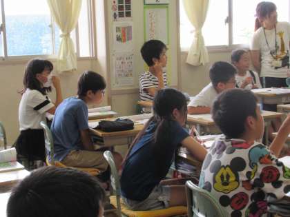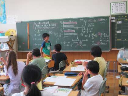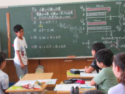 黒板を使って、自分の考えを説明しています。友だちの説明に、興味津々の様子です。
