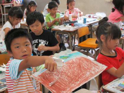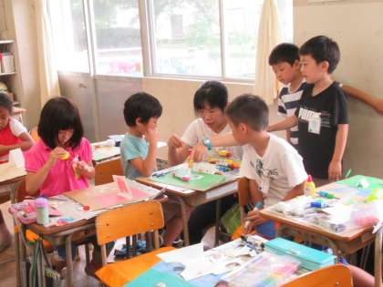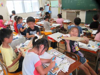 「おってたてたら」の学習です。ボール紙を台にして、紙を折って立てて、作品を作っています。季節柄か、海を舞台にした子が多かったようです。